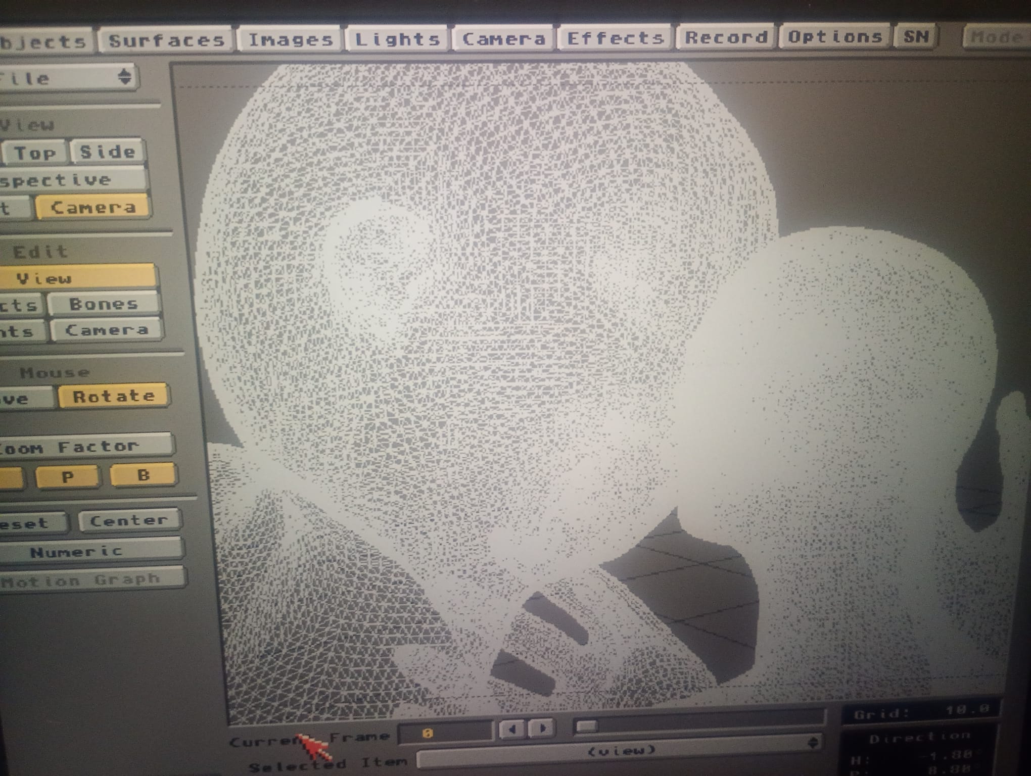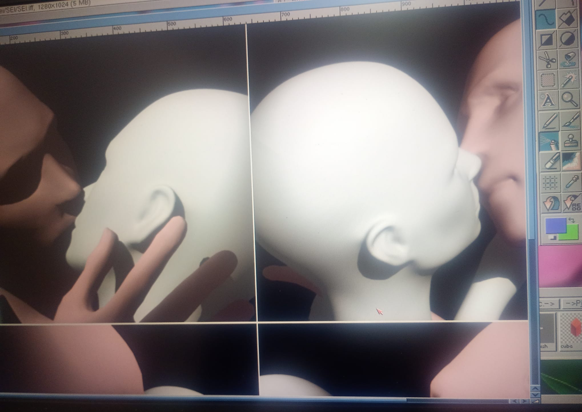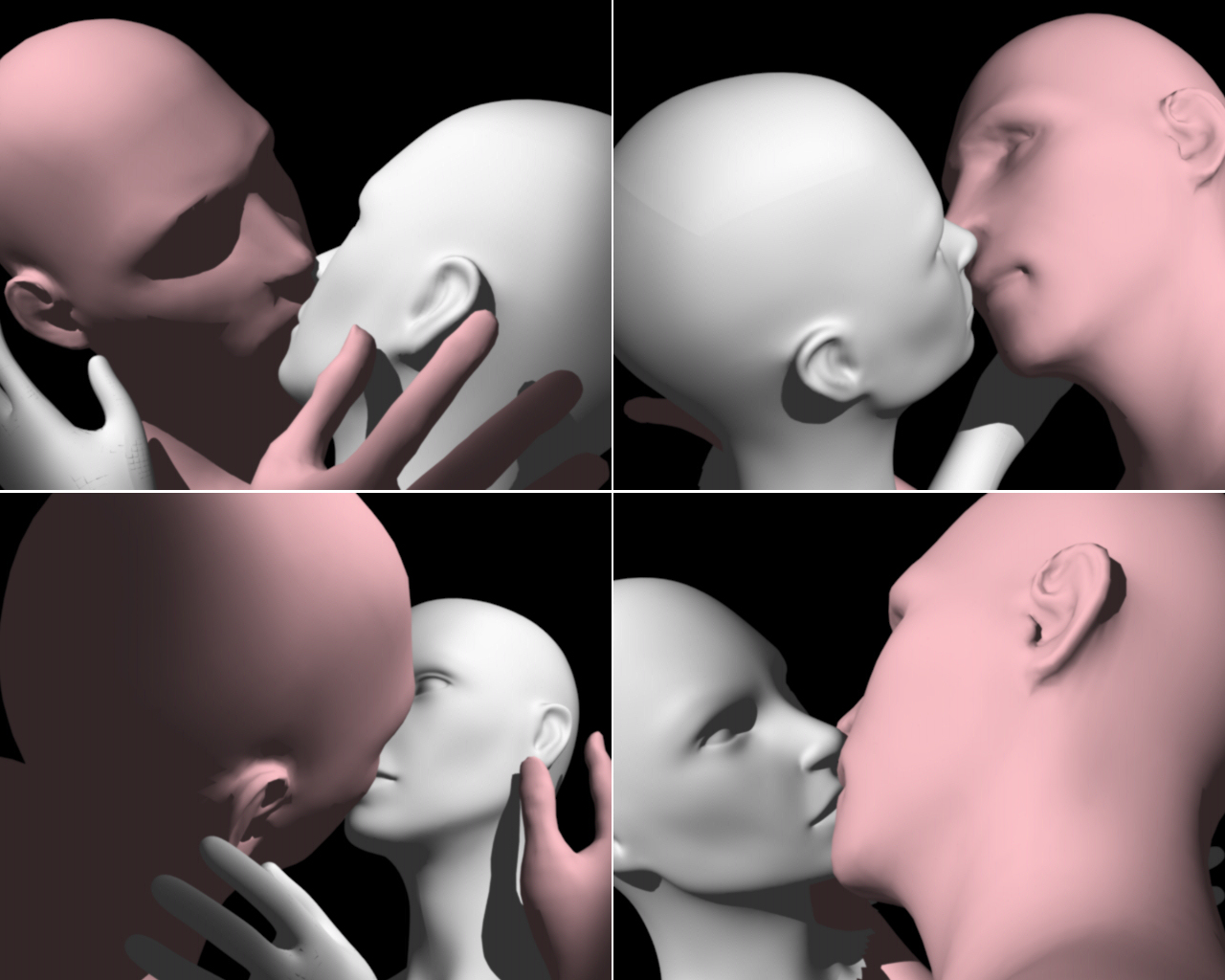 Ho quindi avviato il calcolo di quattro immagini in risoluzione 640×512 pixel raffiguranti i due umanoidi mentre si baciano, con l’intento di differenziare il più possibile i risultati senza modificare la posizione dei personaggi. Su Amiga reale, infatti, a causa dei modelli wireframe, è molto complicato riorganizzare la posizione di mani e volto. Lo spostamento della camera ha quindi semplificato e velocizzato notevolmente il lavoro necessario.